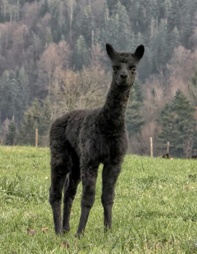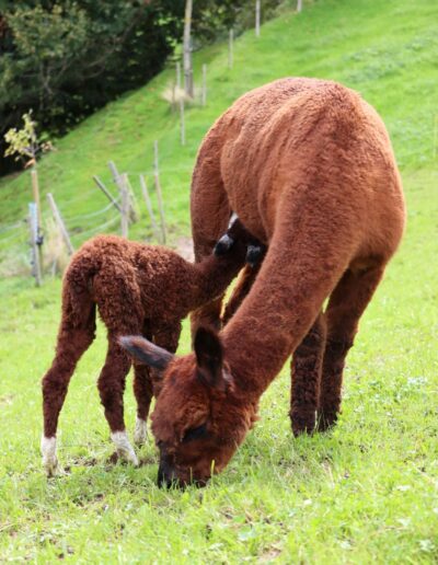 Sie ist das erste Cria von unserem Hengst AOP Amaretto und die Halbschwester von Tamina. Sie rennt gerne mit den anderen Crias umher, macht aber auch sehr gerne Pause bei ihrer Mama. Wenn sie gerade Zeit hat, lässt sich sich sehr gerne die Wangen kraulen.
