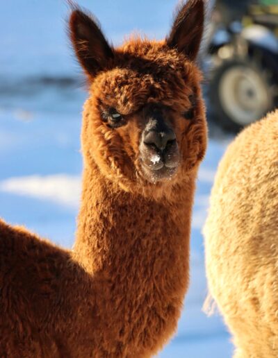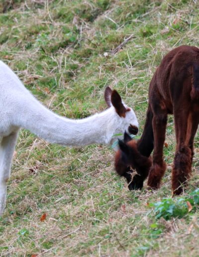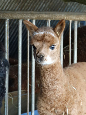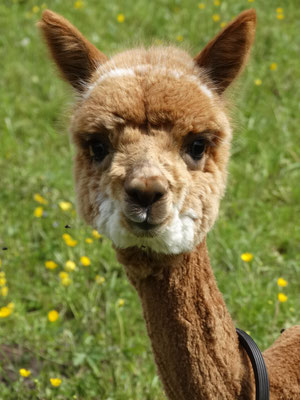 Ihre spezielle Zeichnung macht sie einzigartig. Soleil ist eine liebevolle Mama, die immer für ihr Cria da ist. In der Herde ist sie als Leittier der ruhige Pol.