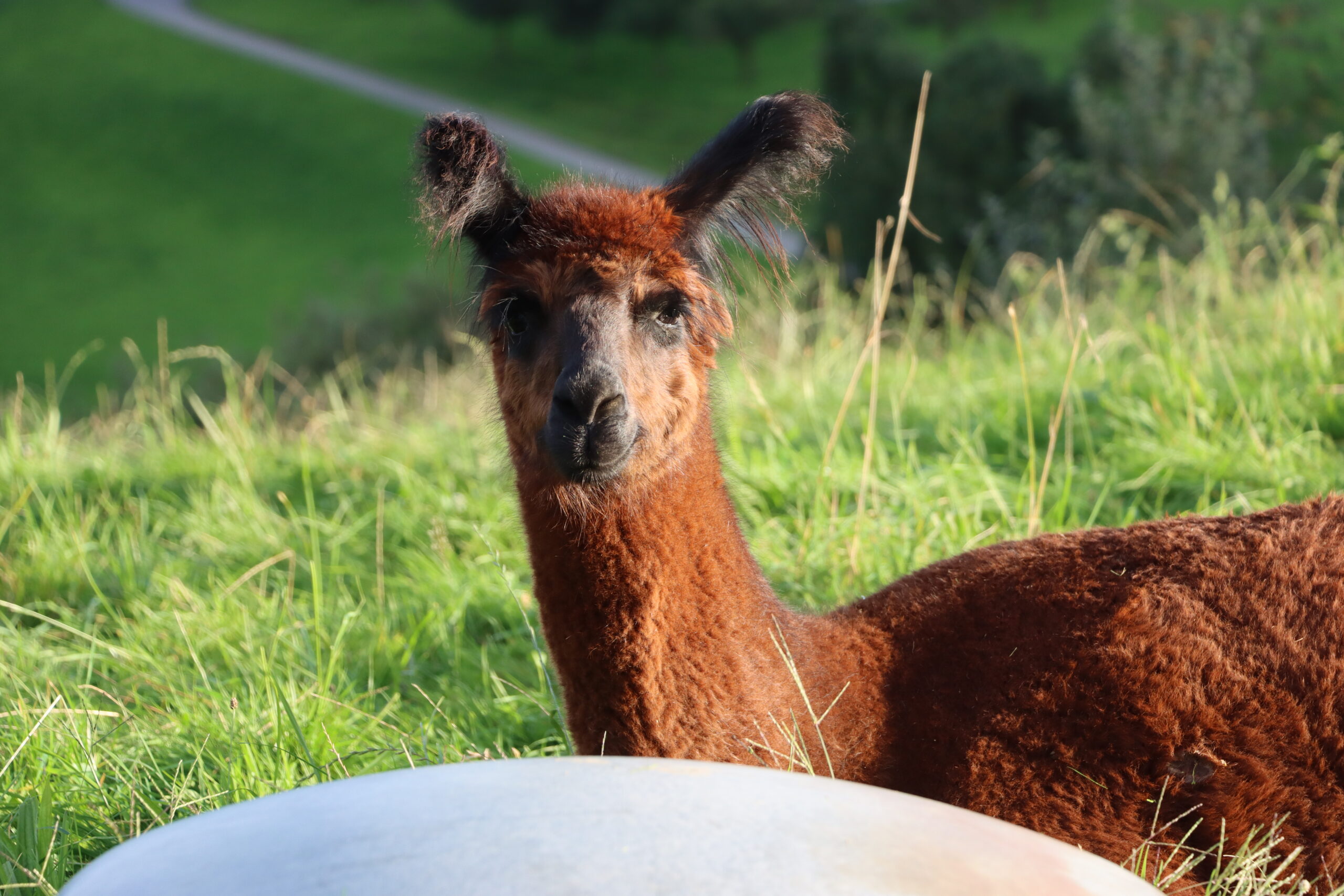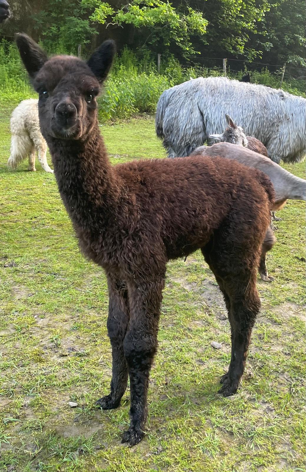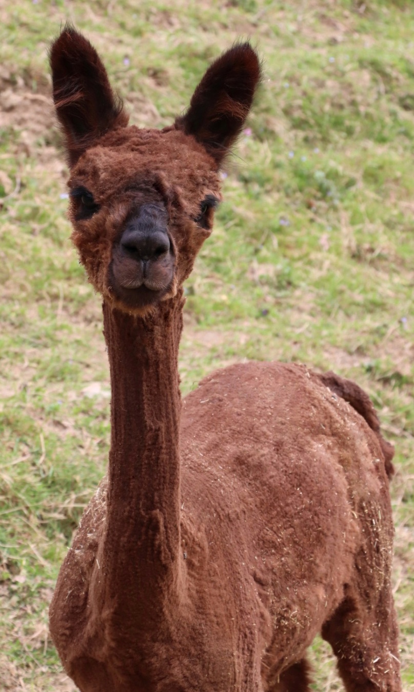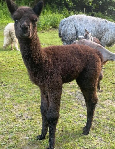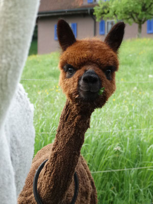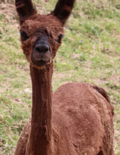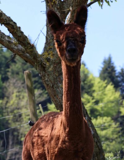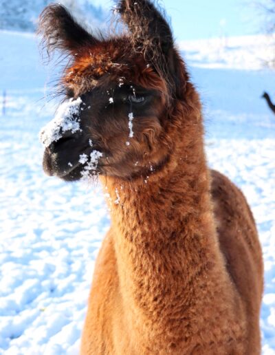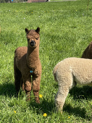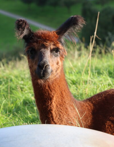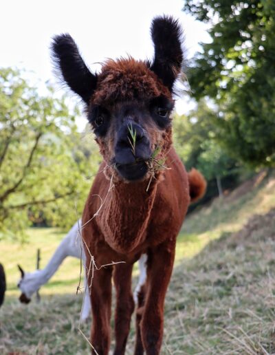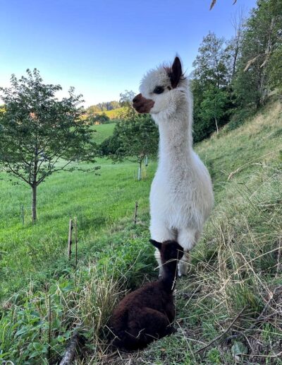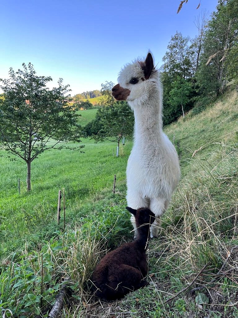 Nanu, wer ist denn hier in mitten der Herde mit Bananen-Ohren zu sehen? Maloja ist unser verschmustes Wooly – Lama und ein Herzensprojekt von Andrea. Sie ist die Beschützerin der Herde, unglaublich neugierig und spielt fürs Leben gerne mit den Crias. Den Kleinen irgendwelchen Unsinn beizubringen steht ganz zuoberst auf ihrer ToDo-Liste – ein richtige Wirbelwind.