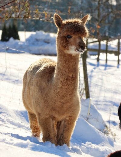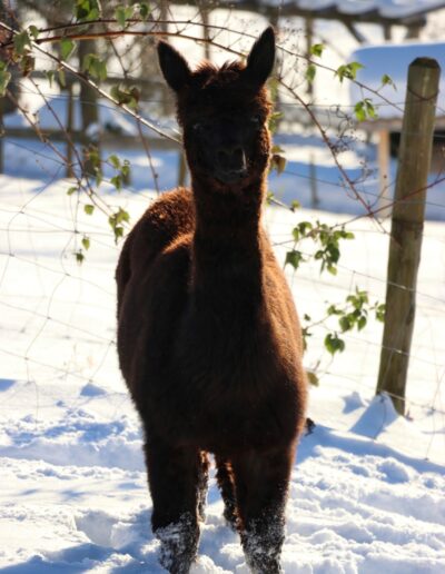 Im November 2025 durfte Tasmania, eine ruhige Stute mit einem typvollen Kopf, einem lieben, sanften Charakter und einem Stammbaum, der sich sehen lässt, bei uns einziehen. Ihre Vlieswerte überzeugen vollumfänglich und das Cria, welches sie erwartet, ist von niemand anderem als NZ Black Black Black Adder.